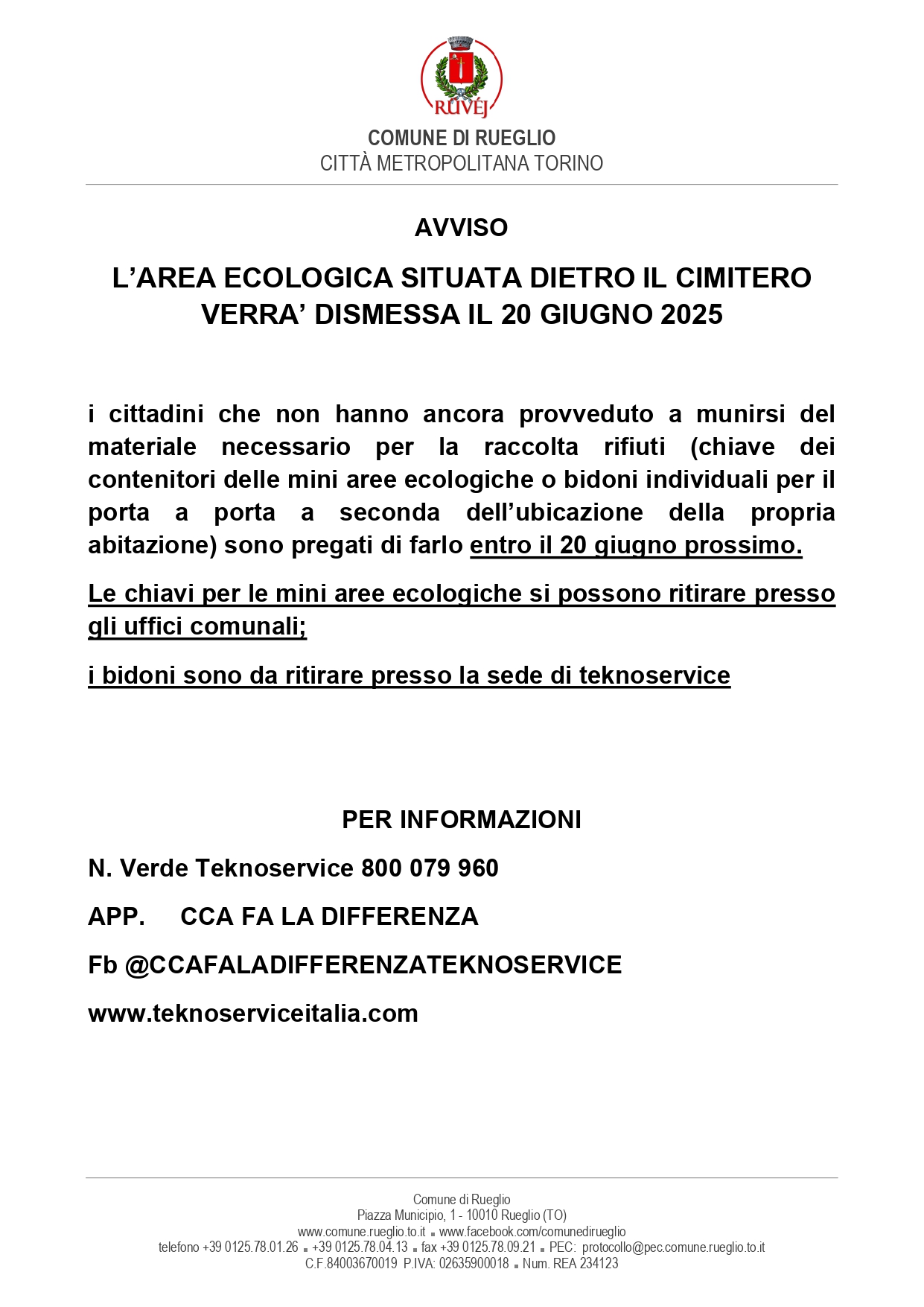 Si informa che l'area ecologica posta dietro il cimitero verrà dismessa definitivamente il 20 Giugno 2025.