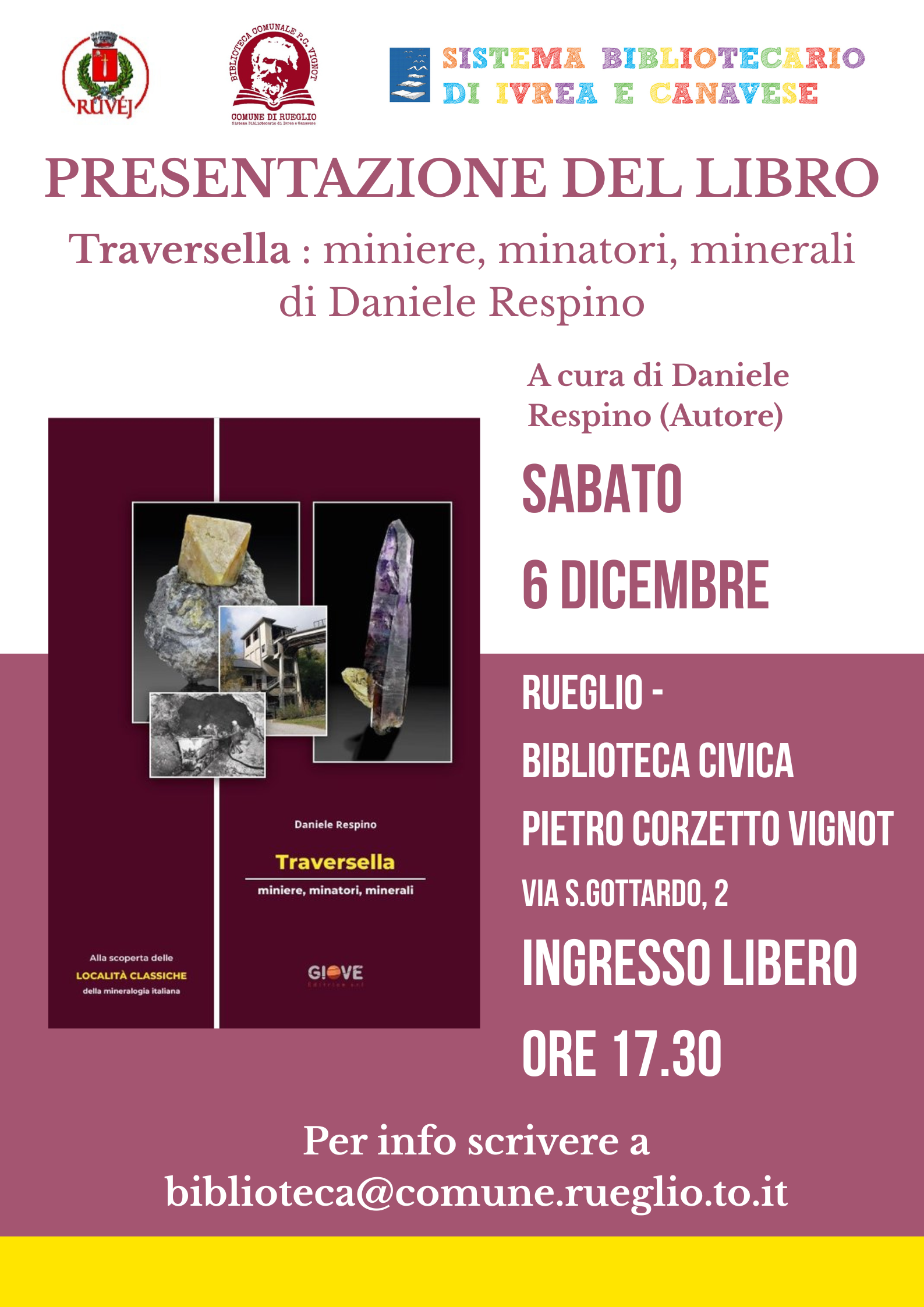 Si informa che sabato 6 dicembre alle ore 17,30 Presso la biblioteca civica Pietro Corzetto Vignot ci sarà la presentazione del libro TRAVERSELLA: miniere, minatori, minerali di Daniele Respino.