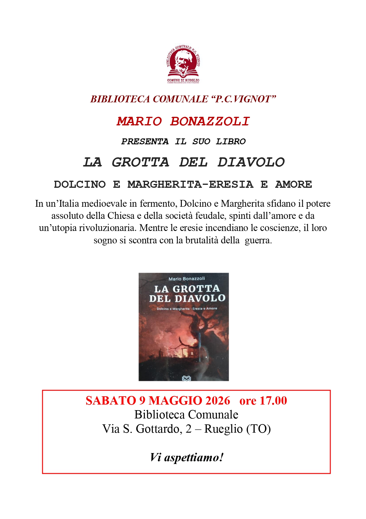 La Biblioteca "P.C.Vignot" accoglie l'autore Mario Bonazzoli per la presentazione del libro "La grotta del diavolo", dando rilievo alla figura di Margherita, giovane nobile originaria di Trento, unica donna tra i discepoli di Dolcino.