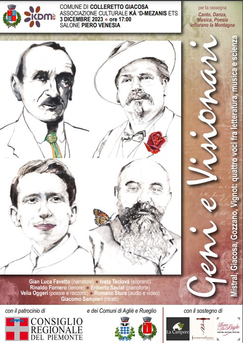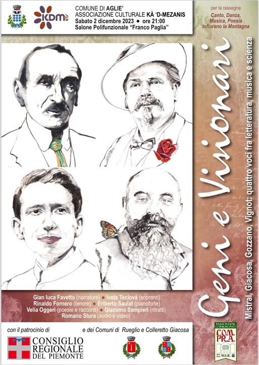 Dopo la prima rappresentazione di Rueglio, lo spettacolo "Geni e Visionari. Mistral, Giacosa, Gozzano e Vignot: quattro voci tra letteratura, musica e scienza" si replica nei due Comuni che, unitamente al Consiglio Regionale del Piemonte e al Comune di Rueglio, hanno patrocinato lo spettacolo.