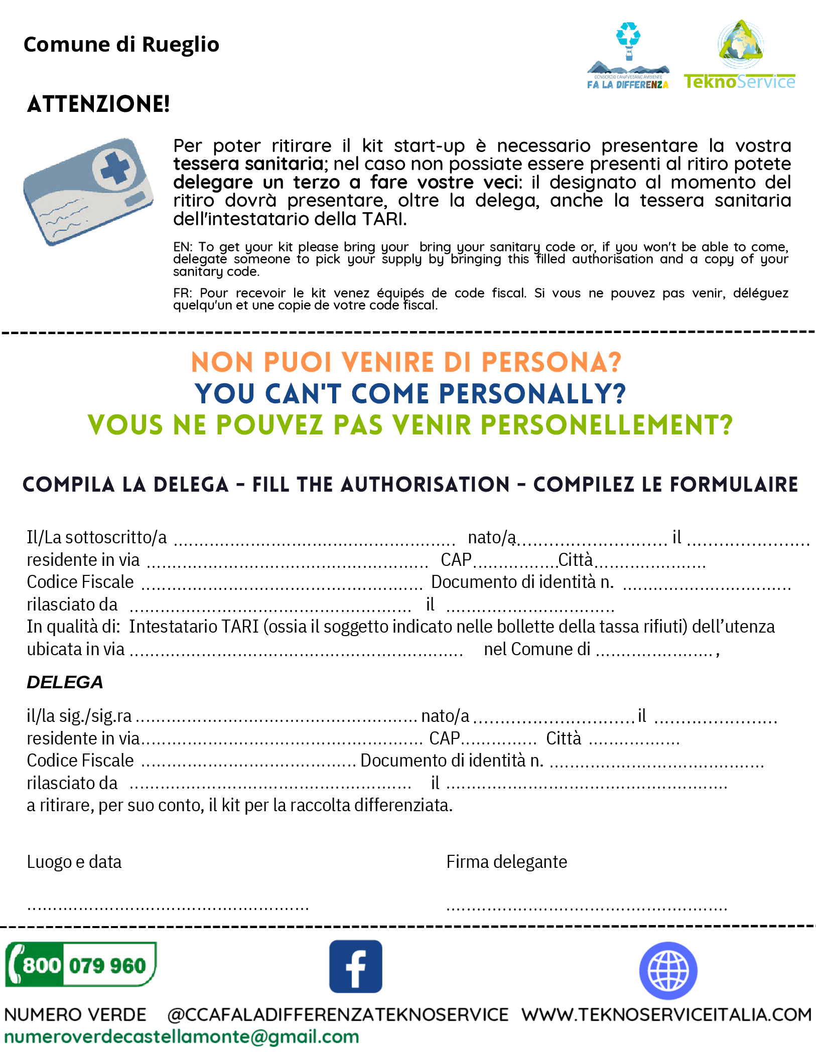 - un delegato munito della delega (compilata utilizzando il modulo allegato in calce al presente avviso) e di copia del Codice Fiscale dell’intestatario TARI.