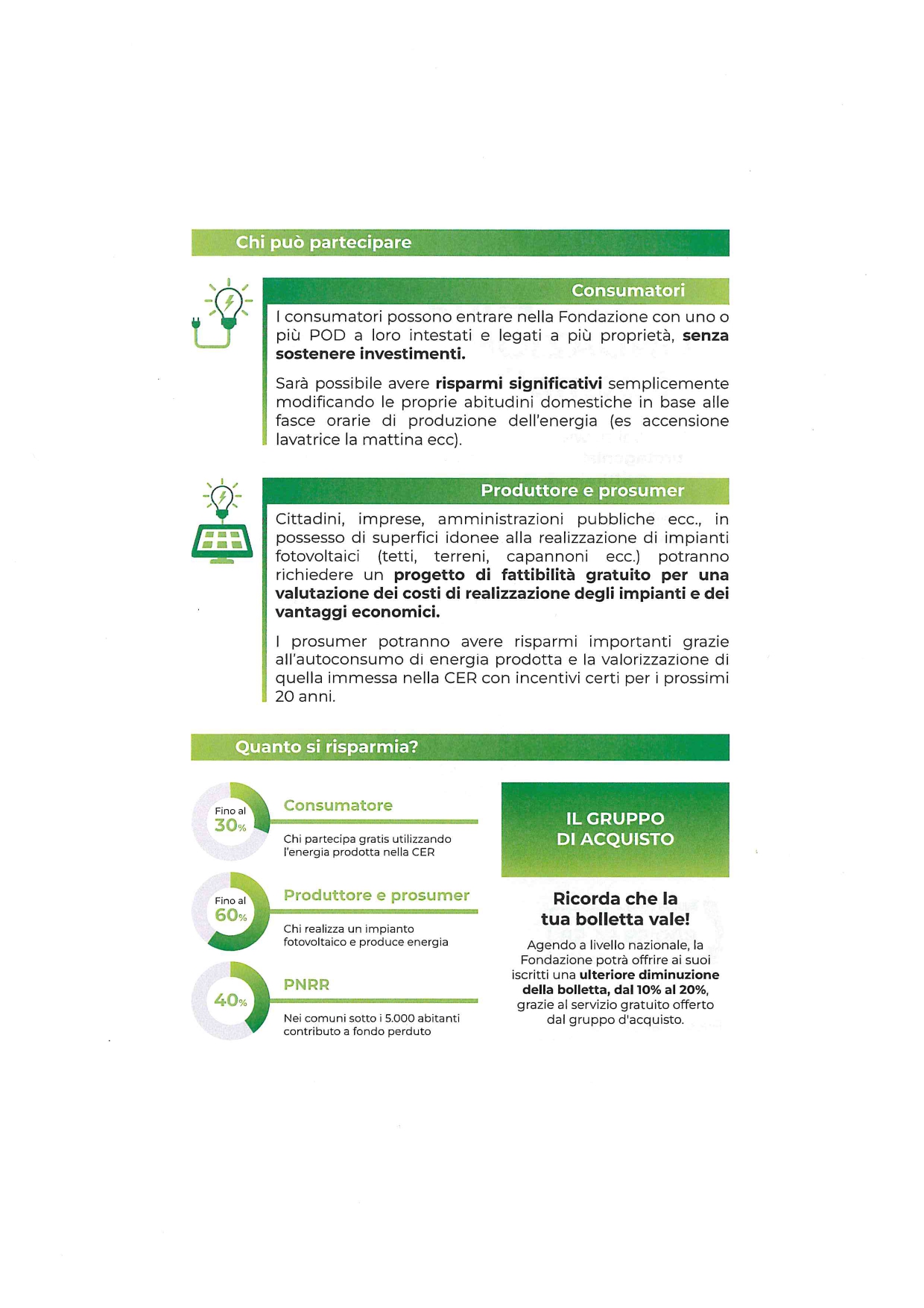 1. lnstallare impianti fotovoltaici con contributo del 40°/o a fondo perduto fino al 31 marzo 2025 (grazie ai fondi PNRR per residenti in comuni sotto i 5000 abitanti) e ricevere assistenza gratuita per le pratiche di installazione.