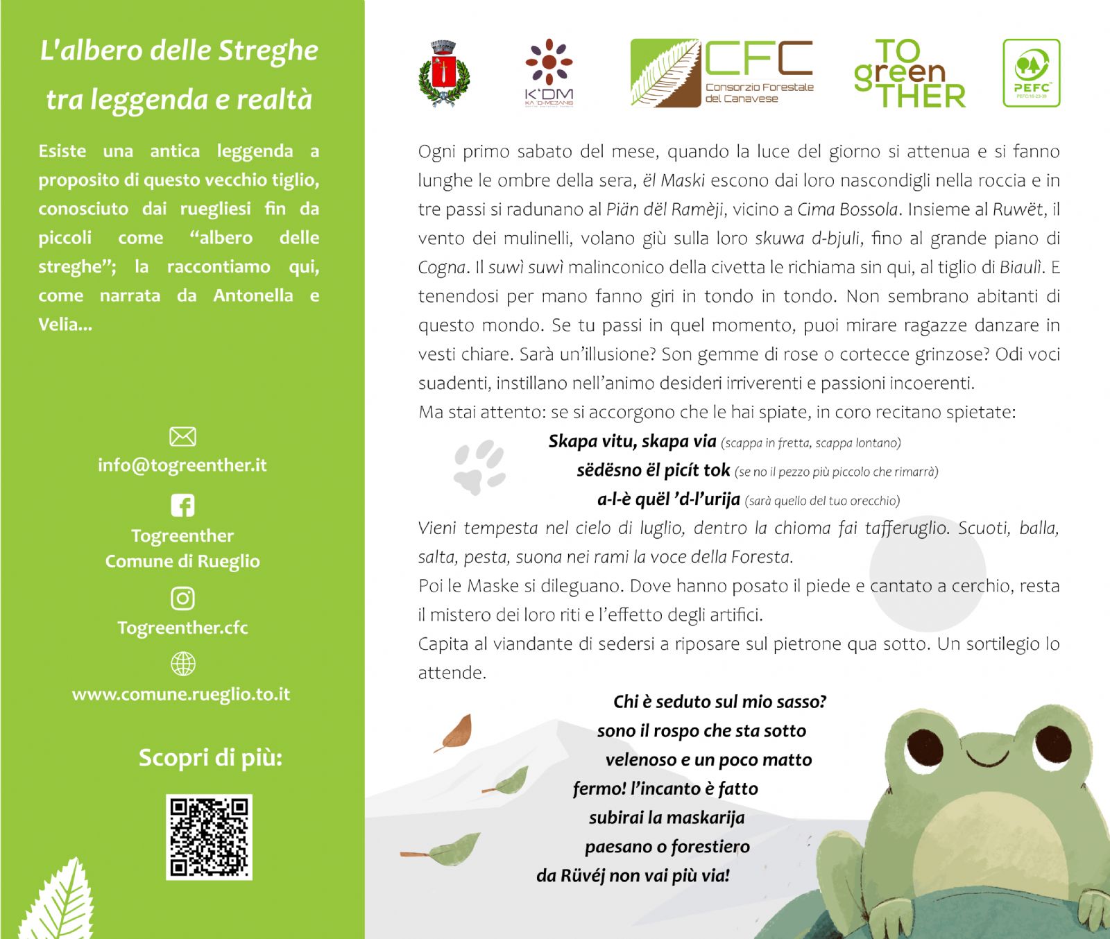 Il così detto “Albero delle Streghe” è un vecchio tiglio (Tilia platyphyllos Scop.), profondamente radicato nell’immaginario ruegliese, tanto da avere una leggenda tutta sua.