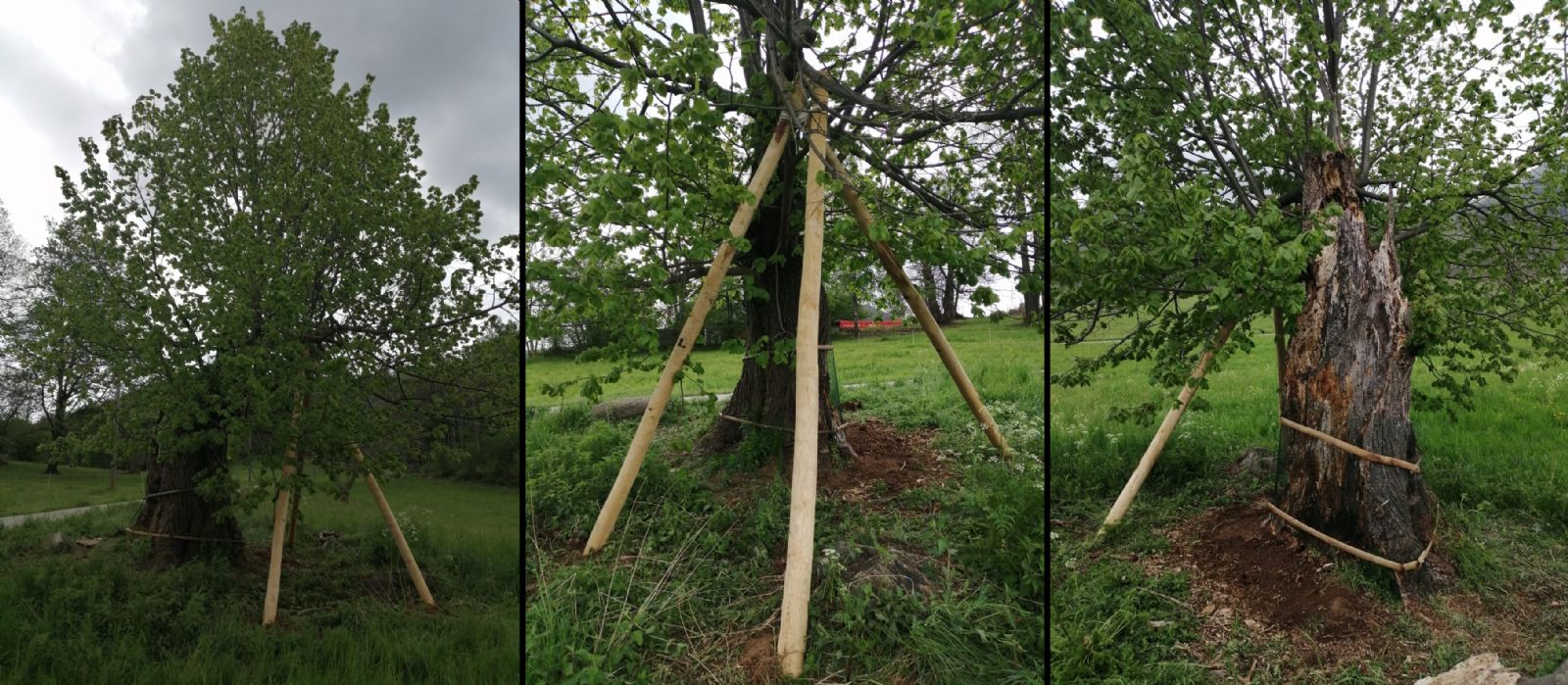 Nel corso dell’intervento sono stati posizionati dei pali a sostegno della porzione della chioma rimasta viva (che risultava fortemente sbilanciata), e la cavità del tronco è stata riempita con materiale organico misto (composto da terriccio, lapillo e cippato).