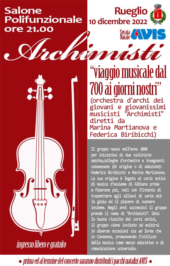 L'orchestra d'archi Archimisti propone, preso la Sala Polivalente Comunale, un percorso attraverso la musica, partendo dal 700 fino ad arrivare ai giorni nostri.