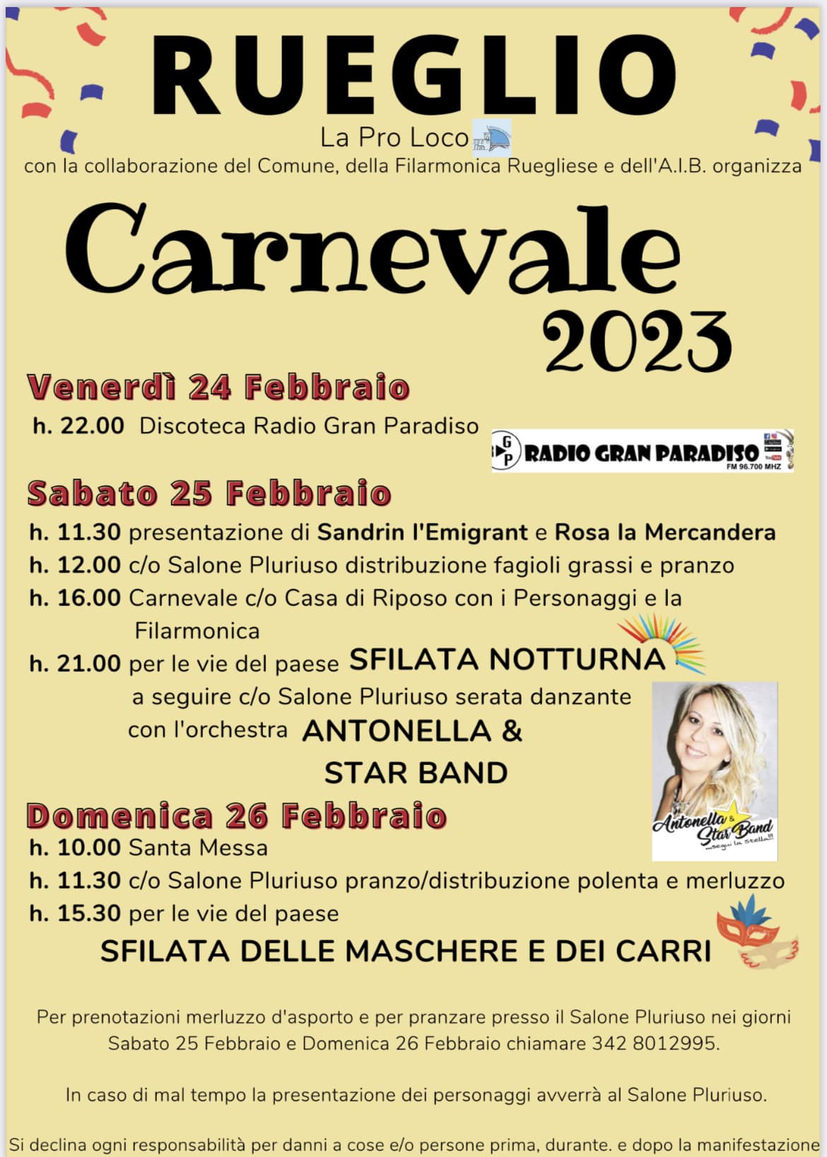 Ore 11:30 - Sala polivalente comunale –polenta e merluzzo (pranzo in loco e asporto);