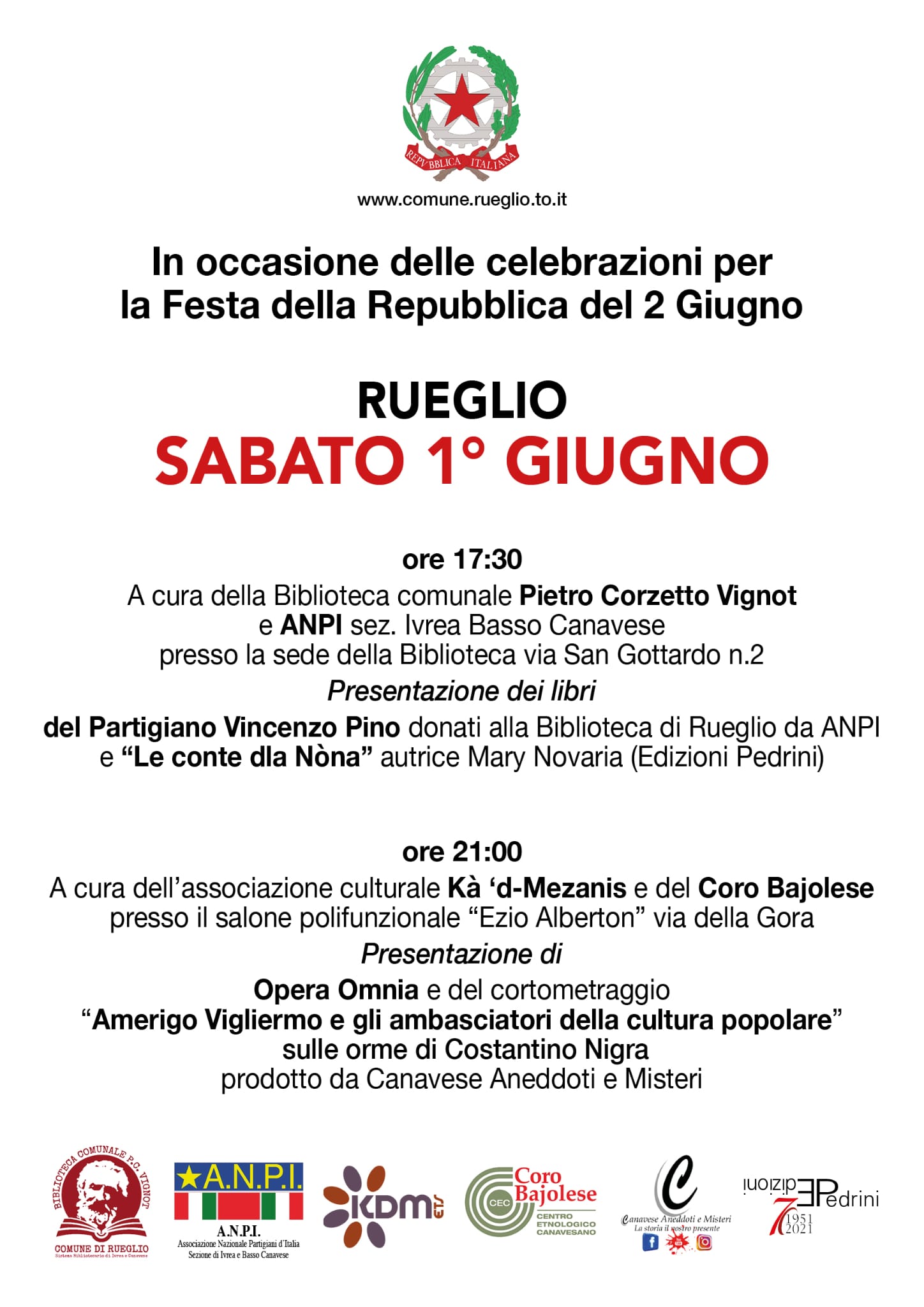 La Comunità di Rueglio sabato 1° giugno, è invitata in occasione della celebrazione della Festa della Repubblica del 2 giugno, ad una doppia serie di eventi.