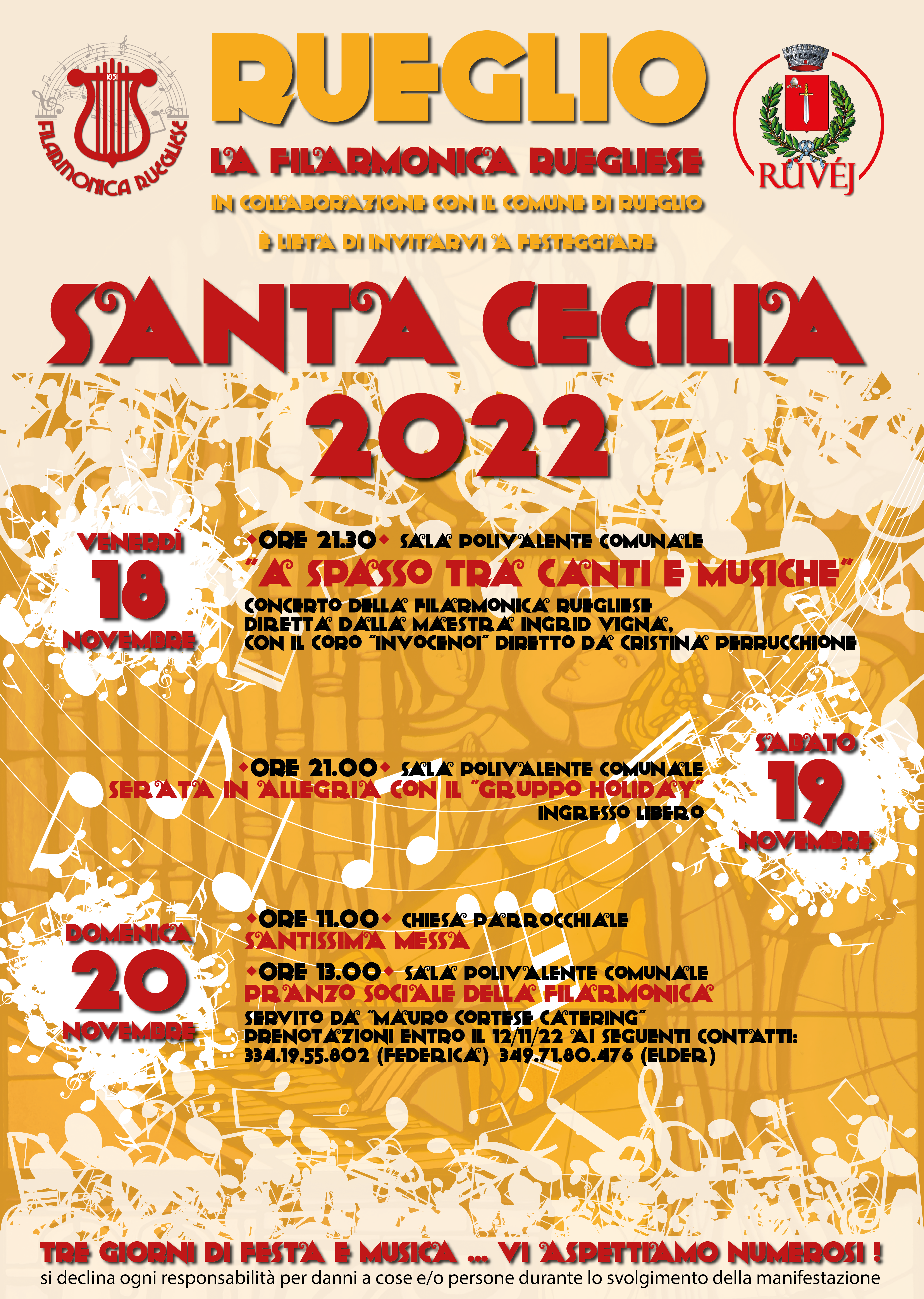 Torna come ogni anno l'appuntamento con le celebrazioni della Festa di Santa Cecilia, organizzate dalla Filarmonica Ruegliese. Questo il programma di quest'anno: