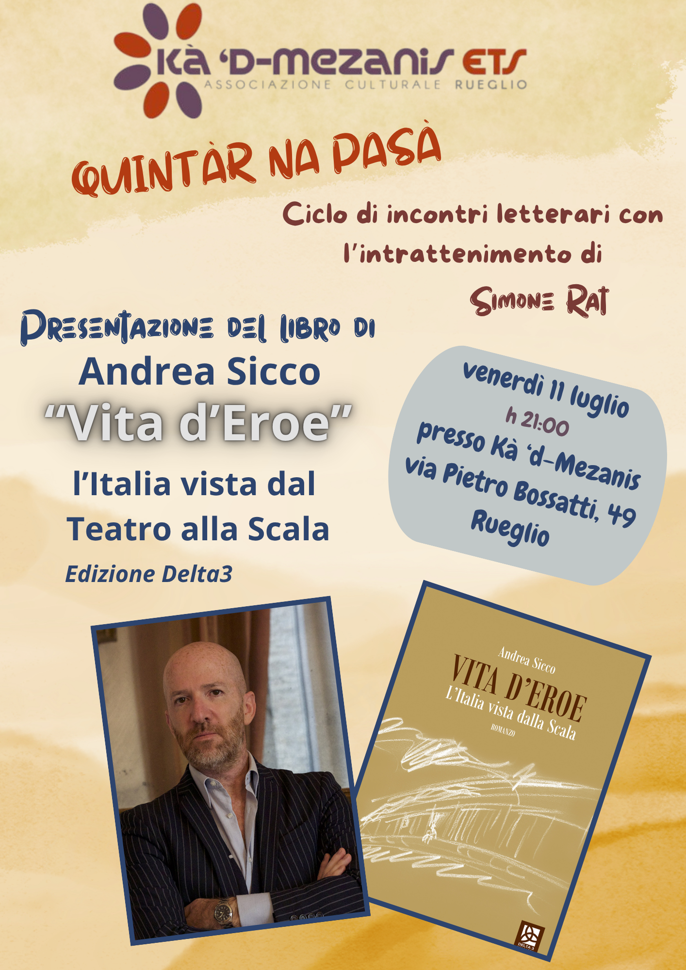 Venerdì 11 luglio, si parlerà di musica con Andrea Sicco (originario di Rueglio), una storia affascinante legata alla prestigiosa Scala di Milano, con le note di Simone Rat e la tisana della buona notte in fine serata. Vi aspettiamo a Kà 'd-Mezanis.