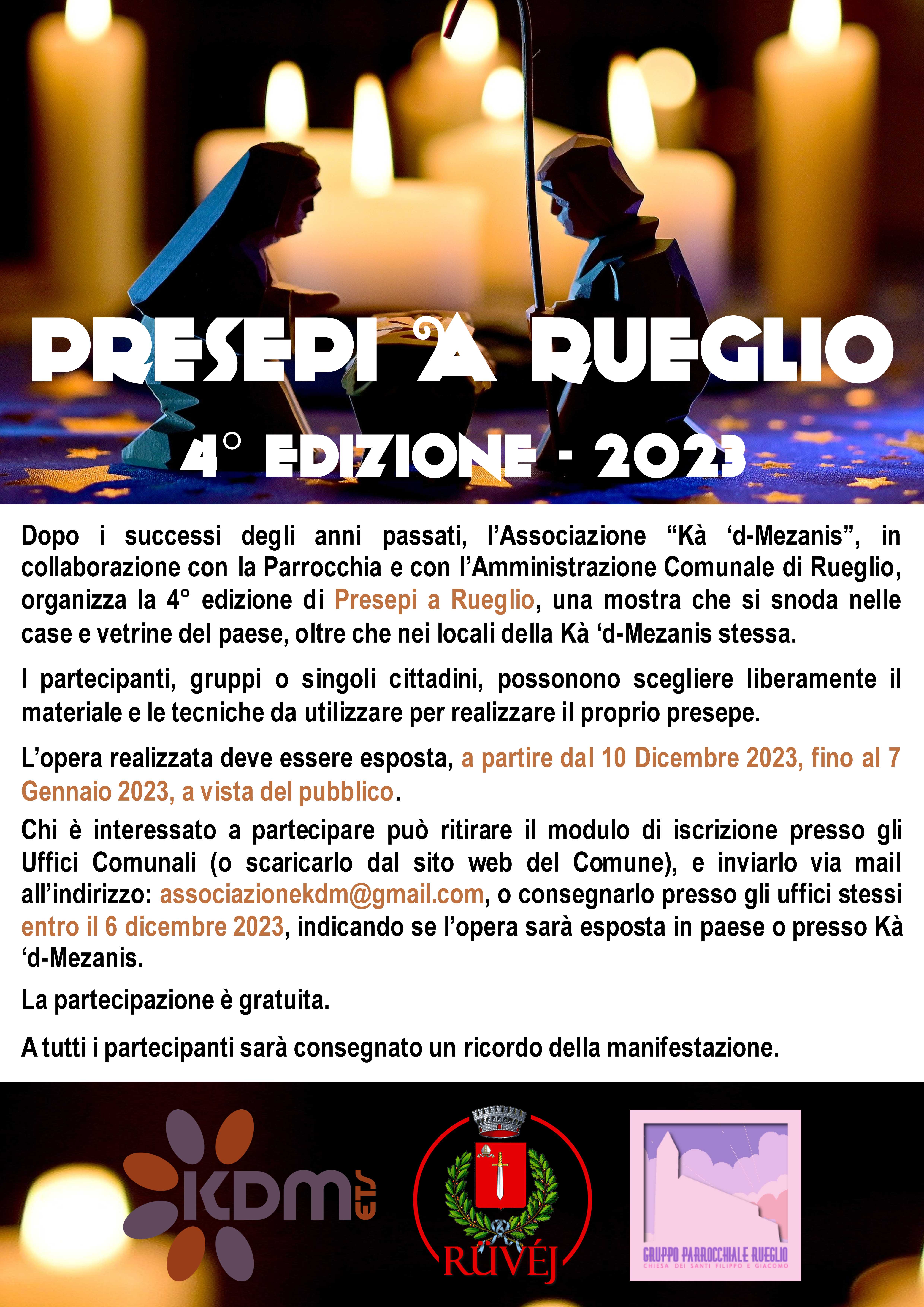 Dopo i successi degli anni passati, l'Associazione "Kà 'd-Mezanis", in collaborazione con la Parrocchia e con l'Amministrazione Comunale di Rueglio, organizza la 5° edizione di Presepi a Rueglio, una mostra che si snoda nelle case e vetrine del paese, oltre che nei locali della Kà 'd-Mezanis stessa.