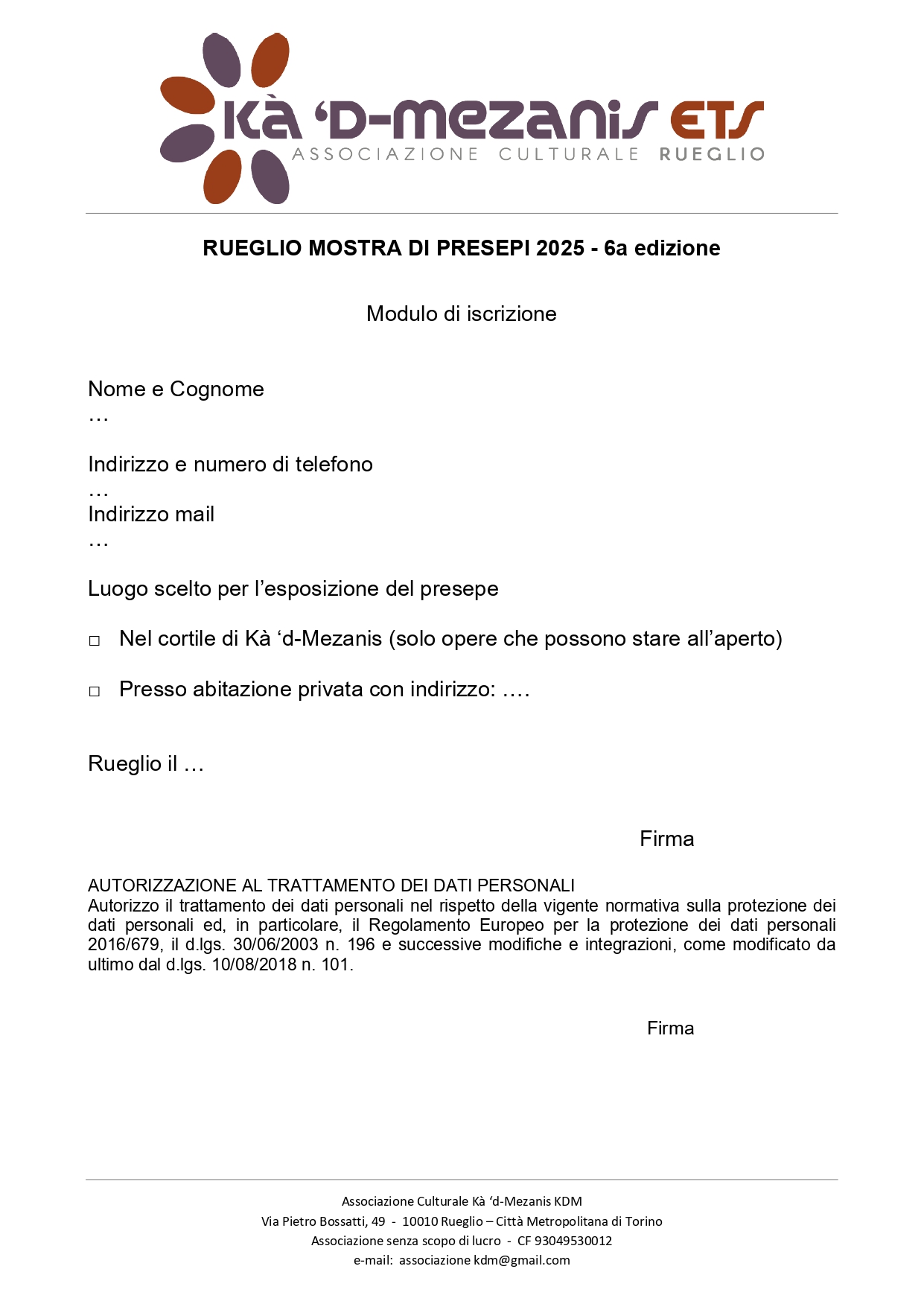 Chi è interessato a partecipare può richiedere il modulo di iscrizione presso gli Uffici Comunali (o scaricarlo direttamente, in fondo a questa pagina), e inviarlo via mail all'indirizzo: associazionekdm@gmail.com, o consegnarlo presso gli uffici stessi entro il 4 dicembre 2025, indicando se l'opera sarà esposta in paese o presso Kà 'd-Mezanis.
