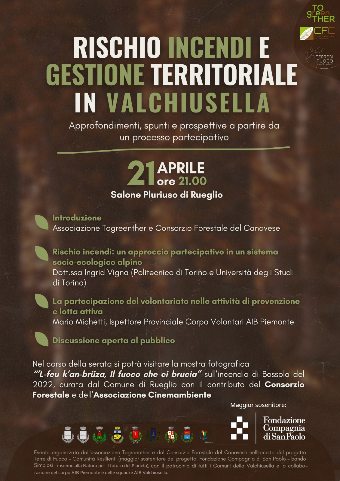 La serata, organizzata dall’associazione Togreenther e dal Consorzio Forestale del Canavese, è parte delle iniziative definite nell’ambito del progetto Terre di Fuoco – Comunità Resilienti (bando Simbiosi - Insieme alla Natura per il futuro del pianeta della Fondazione Compagnia di San Paolo), che prevede il ripristino di un bosco colpito da incendio sopra all’abitato di Drusacco con la creazione di un sentiero ad anello e varie attività in favore delle scuole della Valchiusella e della cittadinanza.