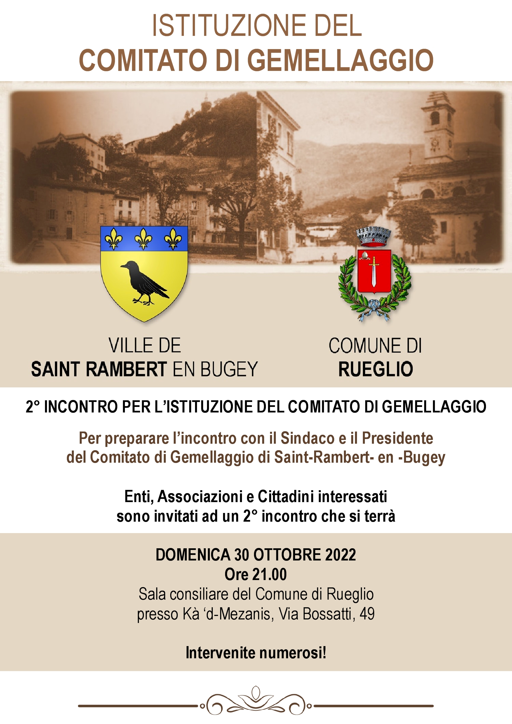Enti, Associazioni e Cittadini interessati sono invitati ad un 2° incontro utile a definire i particolari del prossimo incontro con il Sindaco e il Presidente del Comitato di Gemellaggio di Saint-Rambert- en -Bugey.
