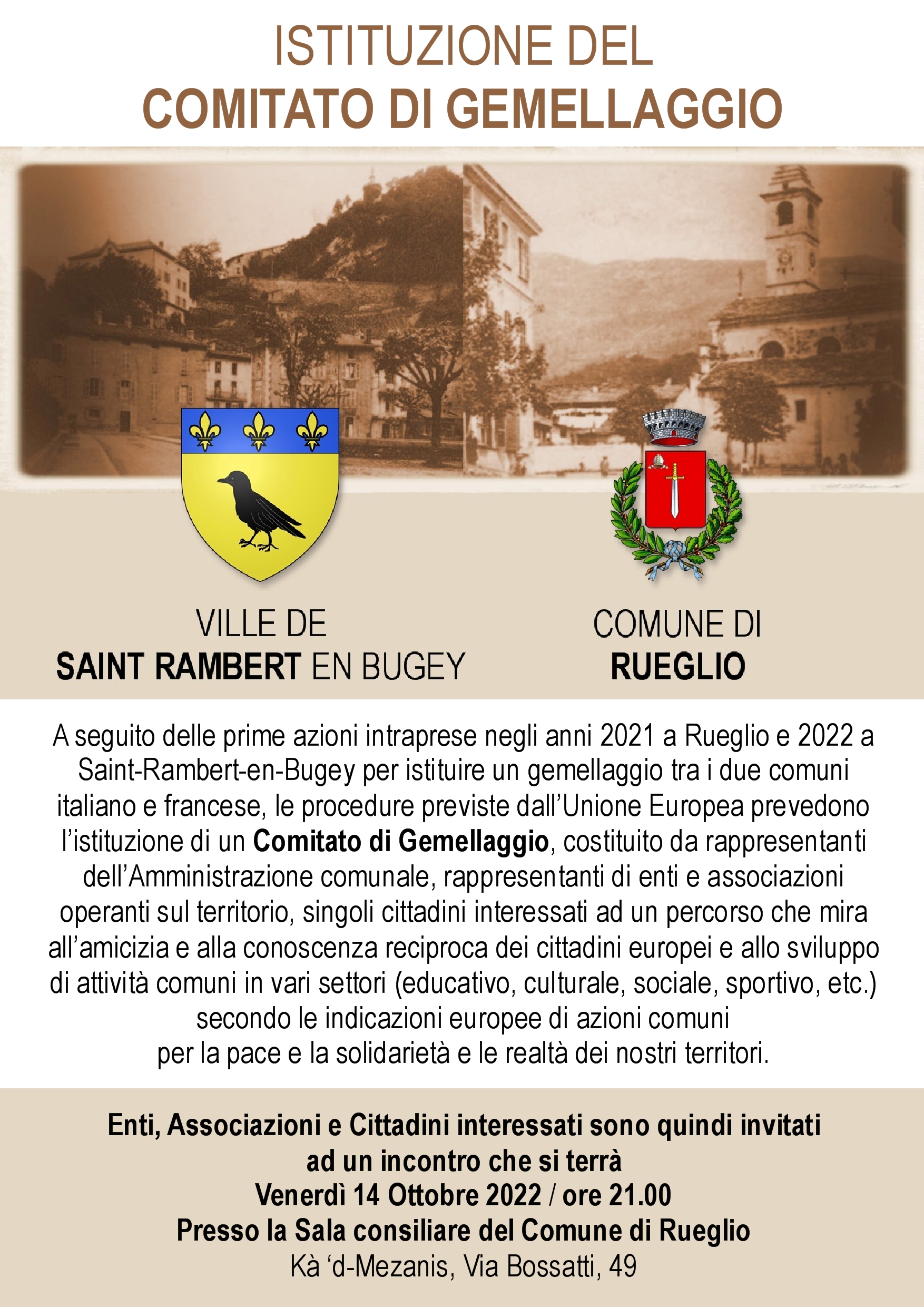 A seguito delle prime azioni intraprese negli anni 2021 a Rueglio e 2022 a Saint-Rambert-en-Bugey per istituire un gemellaggio tra i due comuni italiano e francese, le procedure previste dall’Unione Europea prevedono l’istituzione di un Comitato di Gemellaggio, costituito da rappresentanti dell’Amministrazione comunale, rappresentanti di enti e associazioni operanti sul territorio, singoli cittadini interessati ad un percorso che mira all’amicizia e alla conoscenza reciproca dei cittadini europei e allo sviluppo di attività comuni in vari settori (educativo, culturale, sociale, sportivo, etc.) secondo le indicazioni europee di azioni comuni per la pace e la solidarietà e le realtà dei nostri territori.