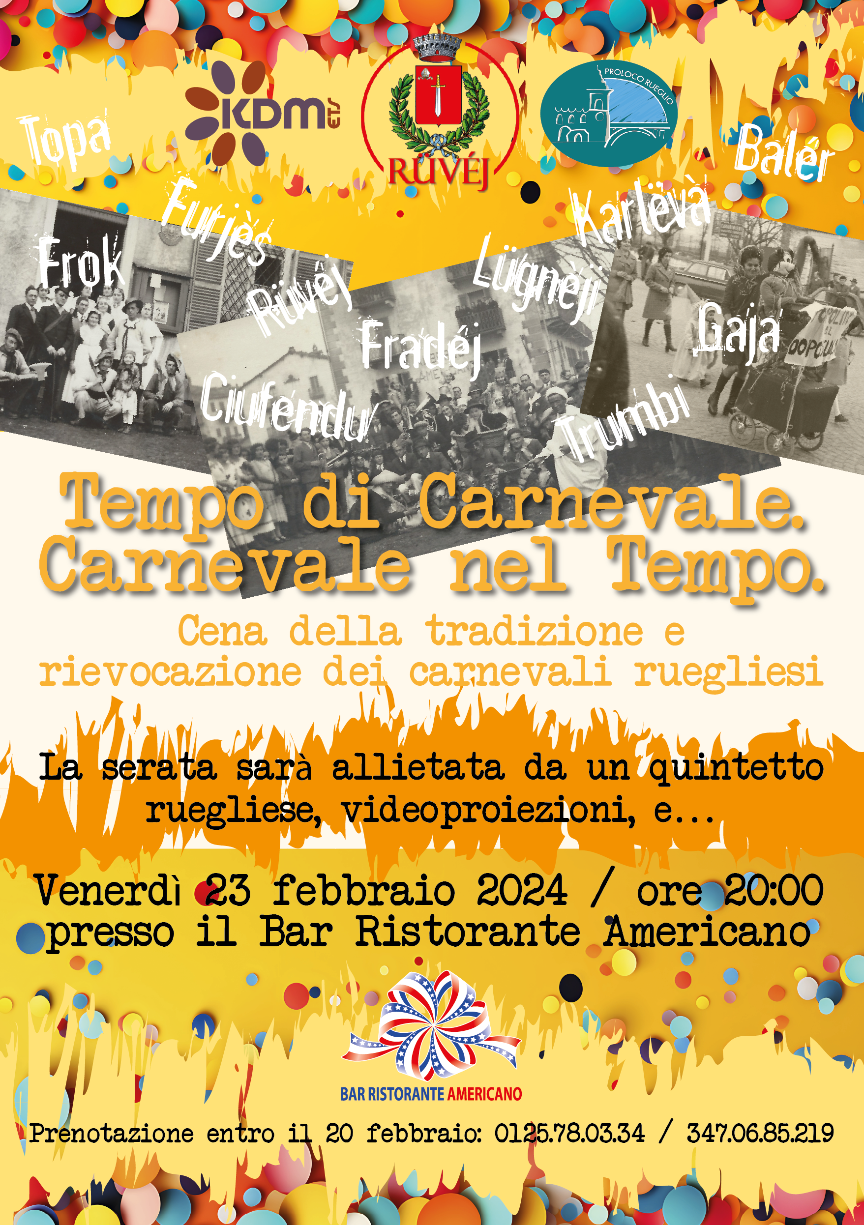 L'Amministrazione Comunale, l'associazione culturale Kà ‘d-Mezanis e la Pro Loco organizzano una serata di rievocazione dei carnevali ruegliesi, accompagnata da una "cena della tradizione".