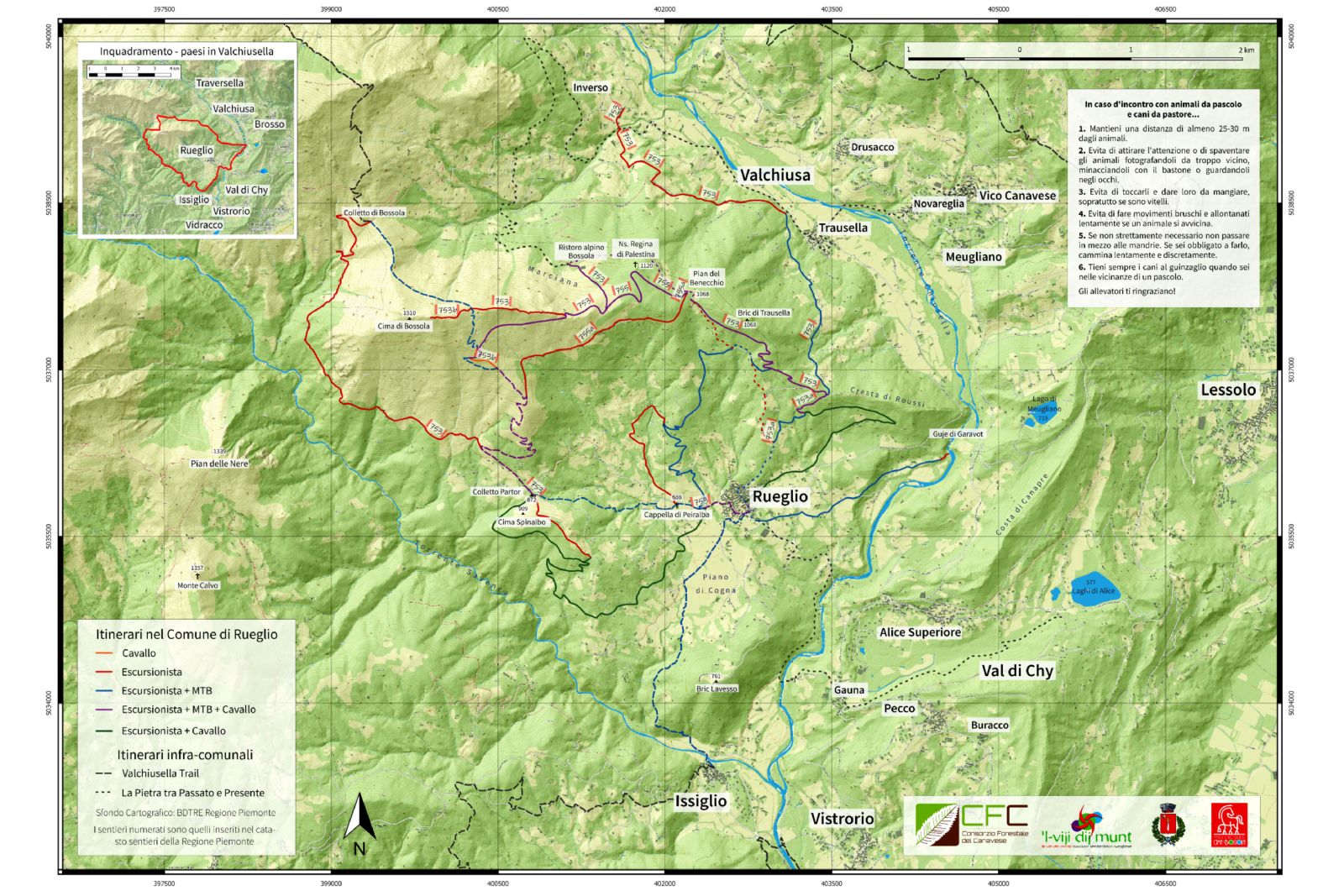 I tracciati delle "vie dei monti" intersecano anche due tracciati di livello sovracomunale, che si estendono ai territori dei Comuni limitrofi: “Valchiusella Trail” e “La pietra tra passato e presente”.